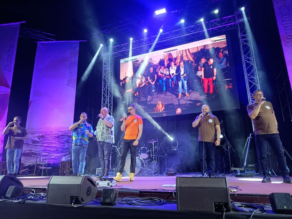 Jak to bywa z jubileuszami na „Shanties”, ilość świętowania zależy zwykle od reżysera koncertu, a że Sąsiedzi byli tutaj także gospodarzami i konferansjerami w jednym, wykazali się skromnością i prezenty oraz niespodzianki przygotowali dla gości – i widzów – a nie dla siebie. Każdy z występujących na scenie wykonawców został na przykład przywitany kreatywną przeróbką jakiejś własnej piosenki, przedstawiającą w humorystyczny sposób jego dokonania. Zespół North Cape odwdzięczył się szanownym jubilatom prezentem równie zresztą zabawnym, bo podręcznym zestawem sąsiada, obejmującym takie niezbędne zapasy jak cukier, mąka i sól. Największym prezentem dla fanów Sąsiadów była natomiast premiera długo wyczekiwanej nowej płyty zespołu, zatytułowanej „Folk wielki jak świat”. Tytuł bardzo trafny, bo krążek zawiera niezwykle zróżnicowany repertuar, do czego zresztą Sąsiedzi od dawna już przyzwyczaili nas na swoich koncertach. I tym razem było nie inaczej – od wspomnianej „Pieśni wojów” czy czeskiej „Bóg w nas”, przez „Port Amsterdam” Jacquesa Brela, po – rzecz jasna – szanty klasyczne, jak „Pull Down Below” i „Sun Down Below”, no i oczywiście nieśmiertelną „Keję”, która tylko w tej aranżacji rzeczywiście staje się szantą. Poza gospodarzami skład koncertu był zresztą równie mocny – Cztery Refy, Banana Boat (z „Going Back to Weldon”, pieśnią, która, wykonana w języku śląskim, stała się piosenką o katowickiej hucie „Baildon”), North Cape (i kolejna „przemysłowa” pieśń pracy – „Byker Hill and Walker Shore”) oraz Perły i Łotry. Dziwnie tylko było po raz pierwszy od dawna nie usłyszeć w koncercie klasycznym Męskiego Chóru Szantowego „Zawisza Czarny”, który przygotowywał się już do następnego, bardzo wyjątkowego wydarzenia, czyli…